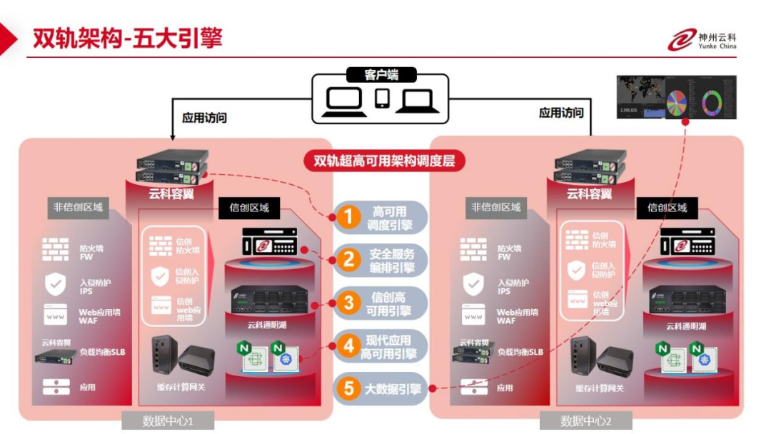 数据中心架构在自主创新的过程中分解为现有架构的非信创区和信创区的两个业务区域,在每个数据中心分为信创区和非信创区后,在两个区域之间的跨区跨域协同方法,东升国际通过5大引擎实现多层次的应用可持续性实践。